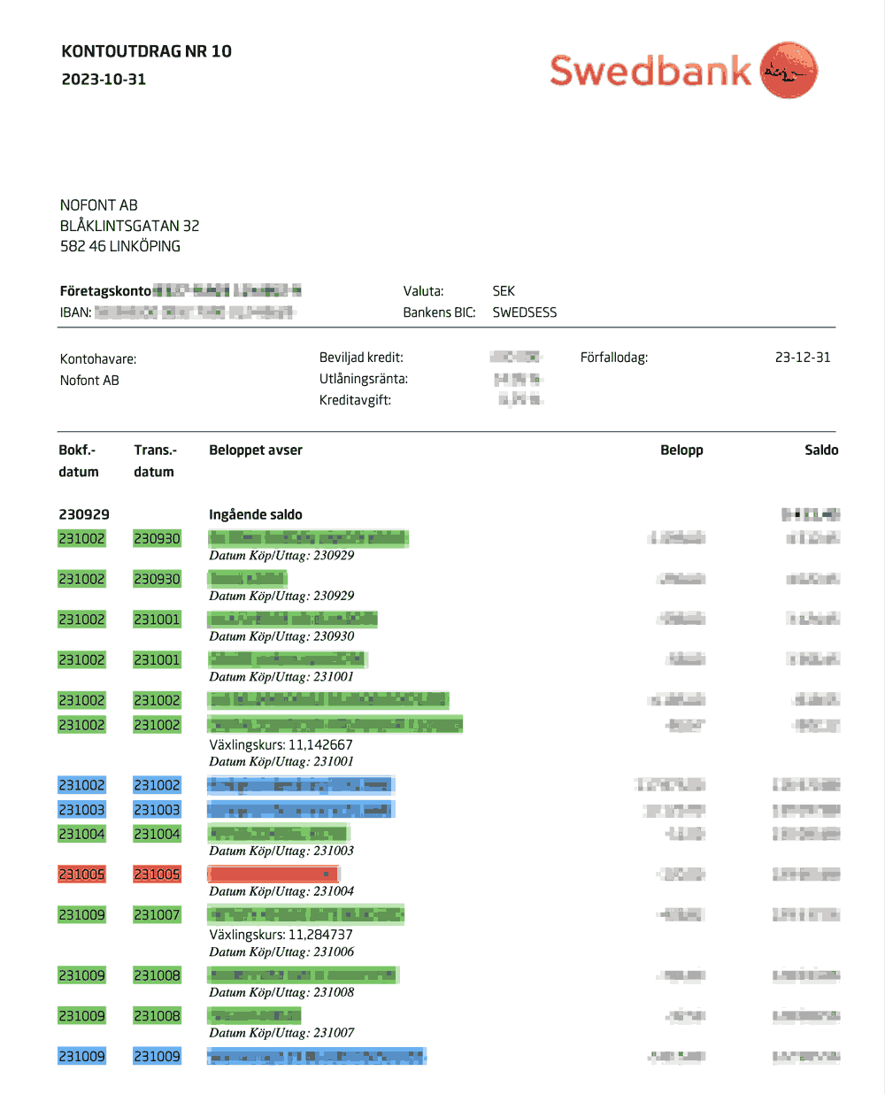 - Highlight bank statement with green for «found the receipt», red for «receipt missing + here’s why explanation», blue for taxes, salaries or incomes. Yellow for stuff that deviates from the normal.