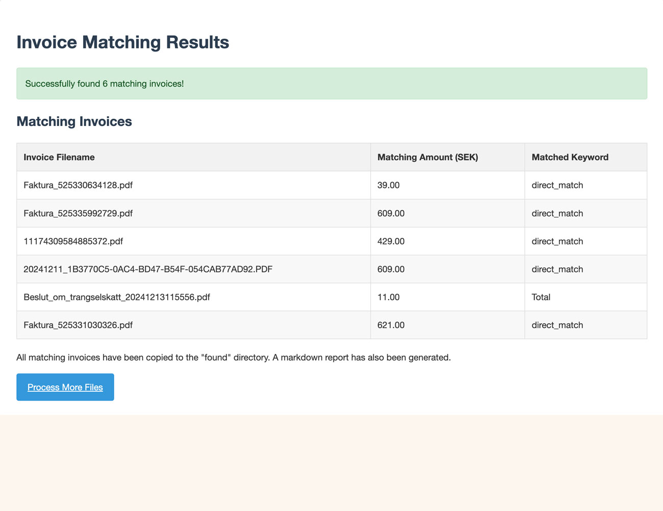 Invoices that has a matching sum shall be moved to the «Found"-directory.