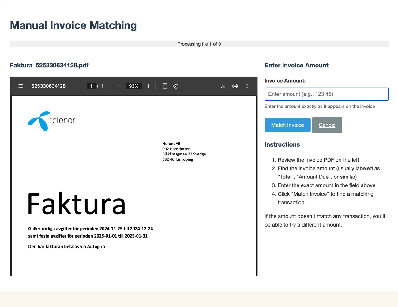 For matches it can’t make automatically, the app displays each invoice pdf and asks me to type in the amount and confirm the match manually.
