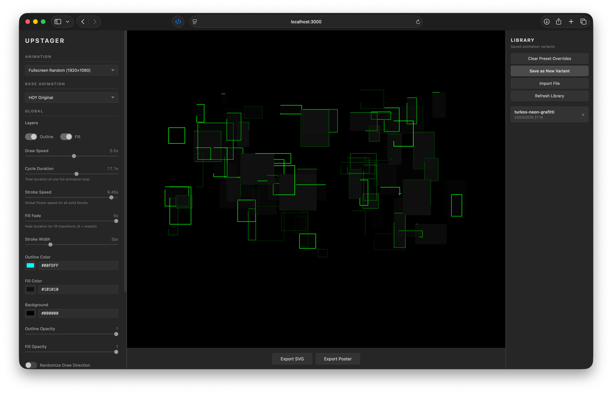 Every combination I like, I save as a variant with a descriptive name: «strobe-outlines», «neon-green», «slow-moody», «cammo-fade-in-slow». These are stored as small json files (simple text data) that I can reload anytime, share with collaborators, or version-control alongside the project.